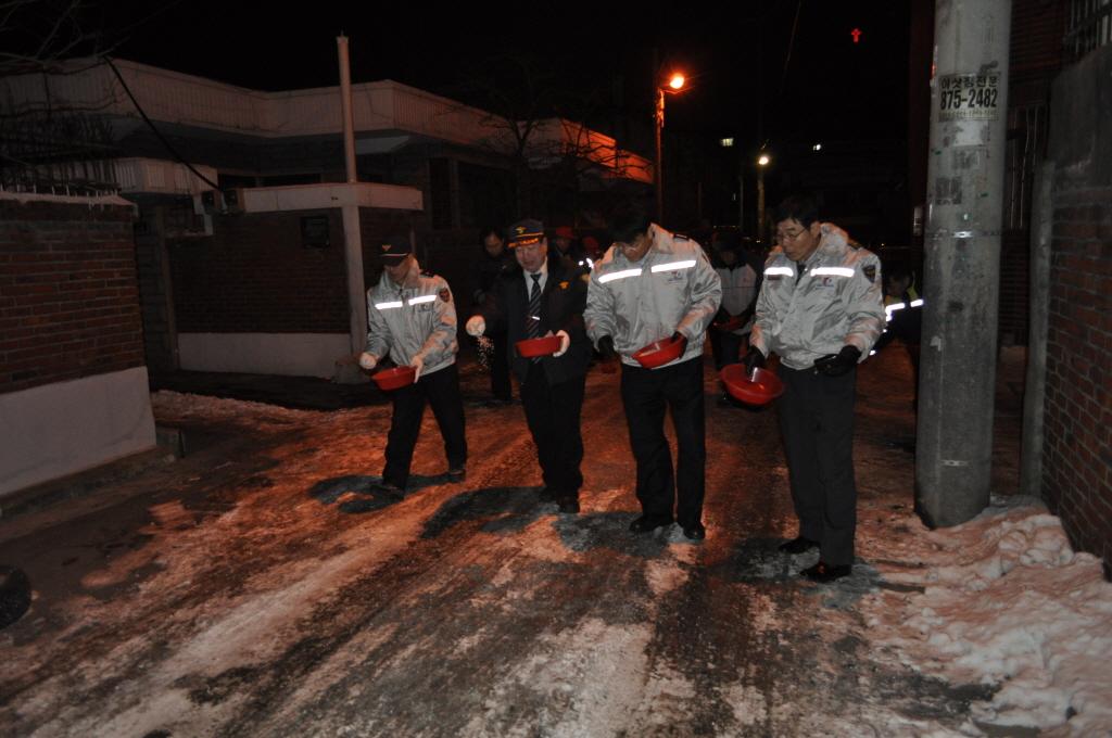 눈을 녹이기 위해 경찰들이 소금을 뿌리는 모습