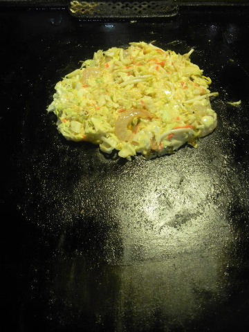 写真以下2枚。海老、お好み焼き(okonomiyaki)(調理中)。