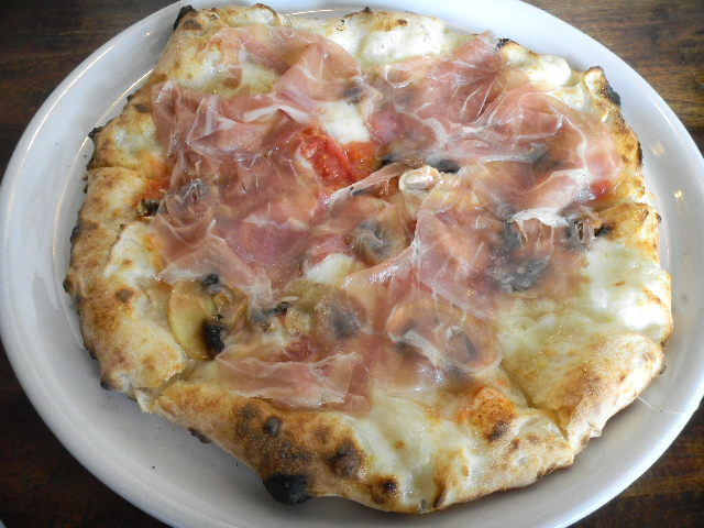 生ハム(ham)、モッツァレラチーズ(mozzarella)、マッシュルーム(mushroom)、ポモドーロ(salsa di pomodoro)のピザ(pizza)。