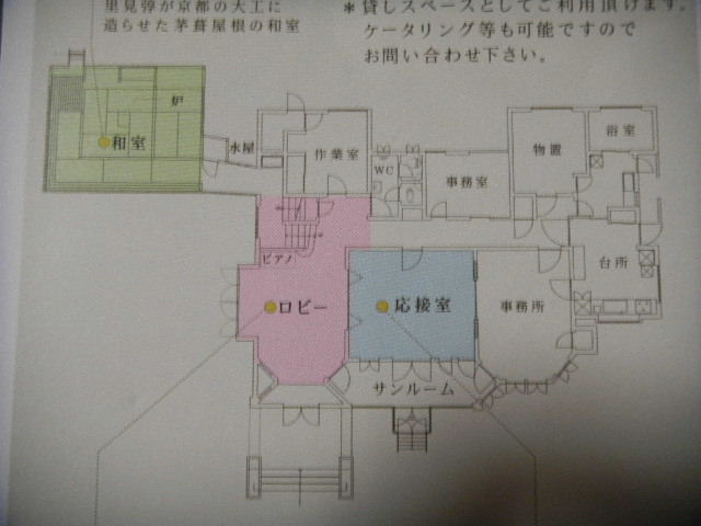 かつての、里見 とん(satomi ton)の住宅(現在は、建築設計事務所として使われている)の、西洋式の建物(住宅のメイン(main)の建物)の1階と、日本伝統式の建物の、間取り図。パンフレット(leaflet)より。。。左上(緑色で塗られている部分)は、日本伝統式の建物の間取り。日本伝統式の建物と、西洋式の建物は、渡り廊下で繋がっています。西洋式の建物(住宅のメイン(main)の建物)の1階の間取りは、以下、左上から、時計回りに、説明して行きます。間取りの上の方、左から。。。里見 とん(satomi ton)の住宅であった時に、書生(syosei。家賃を払わずに、他人の家の一角(一隅)に住まわせて貰う代わりに、簡単な家の手伝いを行いながら、勉強に励む学生。第二次世界大戦前においては、少なからぬ富裕層の家庭が、書生(syosei)を受け入れていました)の部屋であった部屋。トイレの部屋(WCと書いてある所)。里見 とん(satomi ton)の住宅であった時に、女中(maid)の部屋であった部屋。物置(倉庫)として使われている部屋。バスルーム(bathroom)。間取りの下の方に行き、右から。。。台所(kitchen)。里見 とん(satomi ton)の住宅であった時に、食堂(dining room)であった部屋(現在は、建築設計事務所の、事務室(仕事部屋)として使われています)。応接間・居間(living room)(水色(青色)で塗られている部分)とサンルーム(sunroom)。ロビー(玄関・家の入口の空間)(ピンク色で塗られている部分)。この住宅が建てられた当時の、日本の、上流階級の家や、比較的裕福な中上流層の家では、女中(maid)用の部屋や、書生(syosei)用の部屋は、来客等に、その気配を感じさせない為に、なるべく、家の、隠れた見えない場所に配置されていたのですが、この住宅は、当時の、上流階級の家や、比較的裕福な中上流層の家に比べれば、小さいので、女中(maid)用の部屋や、書生(syosei)用の部屋は、応接間・居間(living room)や、食堂(dining room)の、すぐ近くに配置されています。ちなみに、日本伝統式の建物と、西洋式の建物(住宅のメイン(main)の建物)の応接間・居間(living room)は、現在は、建築設計事務所において、顧客等の訪問者を、迎えたり・接待する場所(部屋)、建築設計事務所の代表(所長)の建築士と、建築事務所に勤務する建築士等が会議を行う場所(部屋)、建築設計事務所の代表(所長)の建築士と、建築事務所に勤務する建築士・従業員が、寛いだり、宴会(party)を行ったりする場所(部屋)等として使われている様ですが、パーティー(party)や会合等用に、一般に貸し出されてもいる様です。