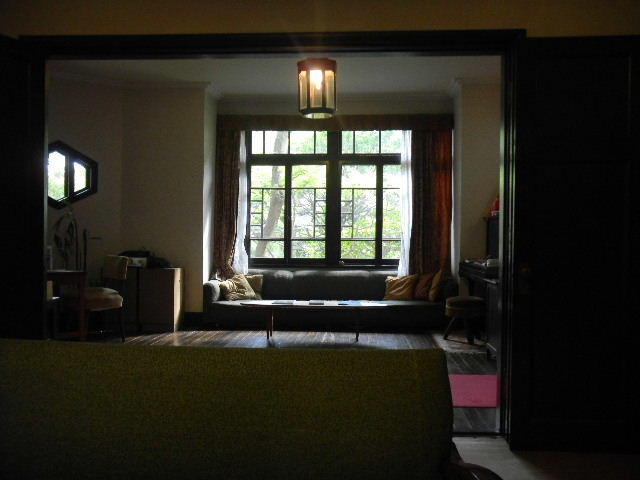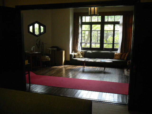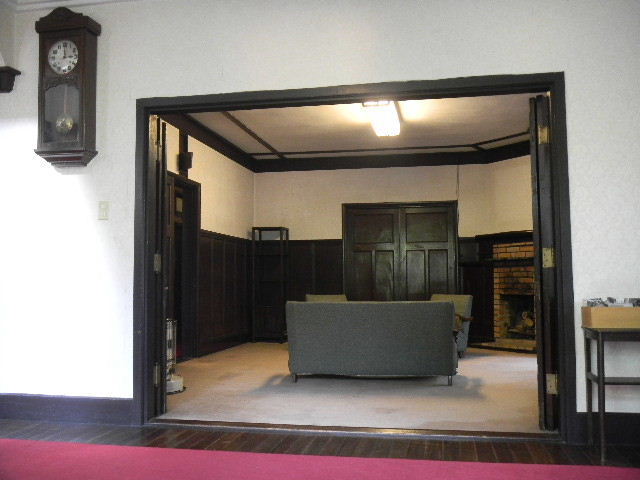 かつての、里見 とん(satomi ton)の住宅の、西洋式の建物の、ロビー(玄関・家の入口の空間)から眺めた、応接間・居間(living room)の一部。