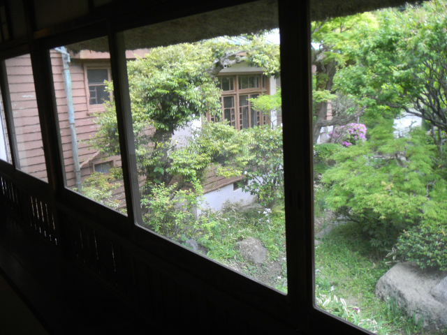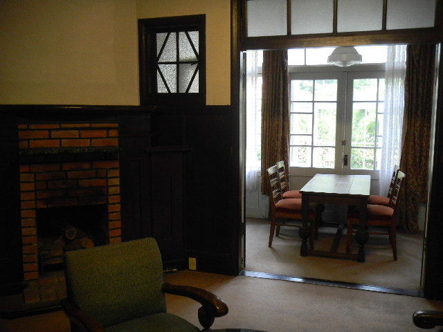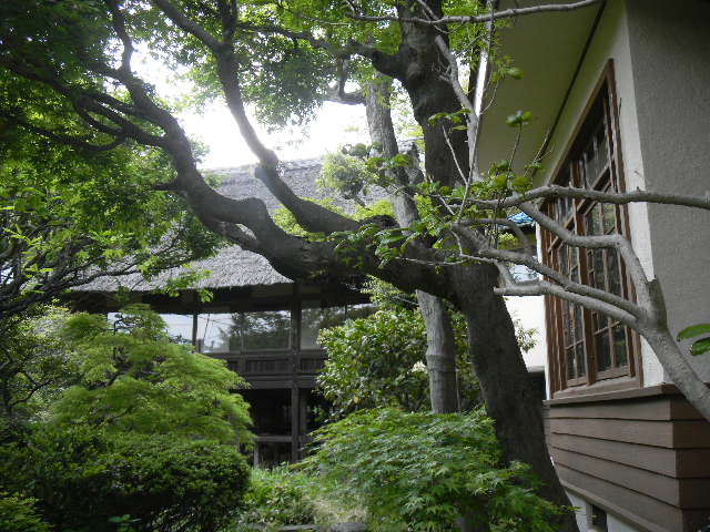 左奥に、日本伝統式の建物が見えます。日本伝統式の建物は、西洋式の建物に増築される形で、1929年に完成しました。西洋式の建物(住宅のメイン(main)の建物)と、日本伝統式の建物は、渡り廊下で繋がっています。