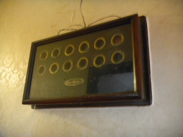 (里見 とん(satomi ton)の住宅であった時に)、女中(maid)の部屋であった部屋の正面の、一階の廊下部分に、設置された、女中(maid)用の、家の主人及び、その家族が、女中(maid)に用事がある事を知らせる装置。女中(maid)に用事がある事を知らせるボタン(button)?(基本的に、住宅の全ての部屋に設置されている)を、家の主人又は、その家族が押すと、この装置は、音が鳴ると共に、どの部屋で、家の主人又は、その家族が、女中(maid)を呼んでいるのか、女中(maid)に知らせます(装置の、丸い部分が、それぞれの部屋を表し、家の主人又は、その家族が、各部屋において、女中(maid)に用事がある事を知らせるボタン(button)を押すと、音が鳴ると共に、(家の主人又は、その家族が、ボタン(button)を押した部屋に該当する)丸い部分に、標が付きます)。この住宅が建てられた当時(1920年代から1930年代頃)の、日本の、中上流階級から上流階級の家では、この様な装置が、設置されているのが、一般的であった様です。ただし、当時の、日本の、上流階級の家や、比較的裕福な中上流層の家では、この様な装置は、女中(maid)用の部屋と共に、家の、隠れた場所にあったのですが、この住宅は、当時の、日本の、上流階級の家や、比較的裕福な中上流層の家に比べれば小さいので、(この住宅においては)、女中(maid)用の部屋と共に、応接間・居間(living room)の、すぐ近くに配置されています(この装置は、応接間・居間(living room)と女中(maid)用の部屋の間の廊下(1階の廊下)に、女中(maid)用の部屋は、1階の廊下を挟んで、応接間・居間(living room)の向かいに配置されている)。