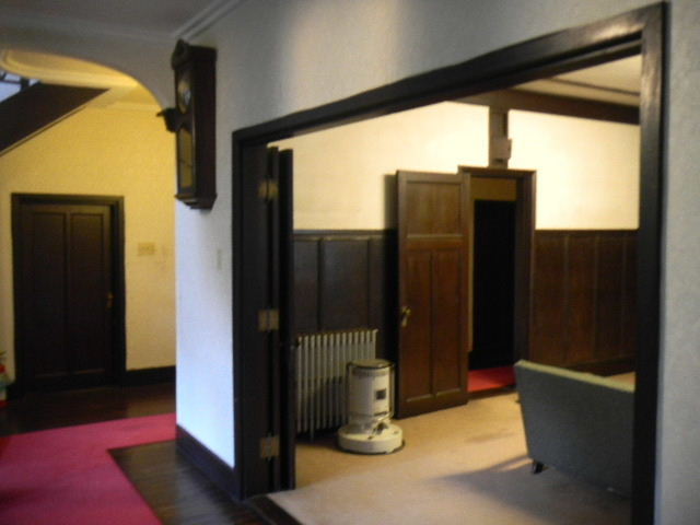 ロビー(玄関・家の入口の空間)から見た、応接間・居間(living room)。奥の扉の向こう部屋は、里見 とん(satomi ton)の住宅であった時に、食堂(dining room)であった部屋で、現在は、建築設計事務所の、事務室(仕事部屋)として使われています(この住宅が、一般公開が行われている時も、公開はされていません。この時は、特別に、少しだけ見せて貰いましたが。。。)。写真では閉まっていますが、奥の扉を開けると、食堂(dining room)(現在は、前述の通り、建築設計事務所の、事務室(仕事部屋)として使われています)、応接間・居間(living room)(及び、応接間・居間(living room)に付属した、サンルーム(sunroom))、ロビー(玄関・家の入口の空間)が、一つに繋がって、一つの、とても大きな部屋の様になり、多くの人を招待するパーティー(party)等に対応出来る設計となっています。