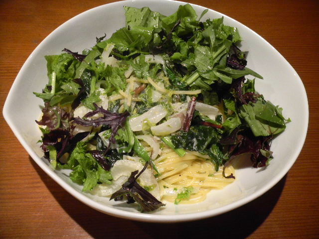 写真以下2枚。鎌倉(kamakura)野菜と、生青海苔の、クリームパスタ(cream pasta)。一人一皿ずつ。二人共、同じ物を食べました(写真は、一人分)。
