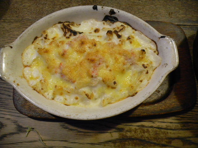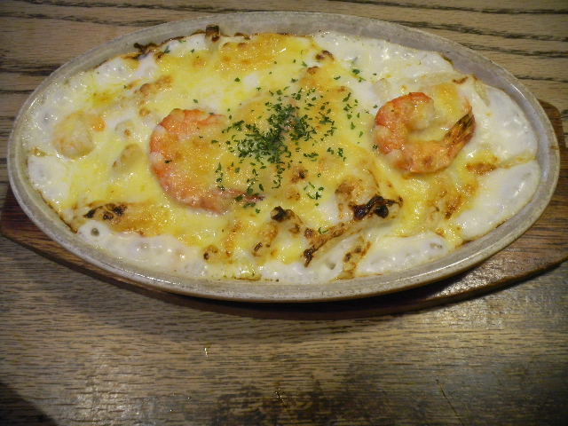 彼女が食べた、海老入り、グラタン(gratin)。ちなみに、彼女は、この時は、飲み物は、アイスティー(冷たい紅茶)と、ソフトドリンク(soft drink)を飲みました(彼女は、アルコール(alcohol)は、体質的に、かなり苦手です)。