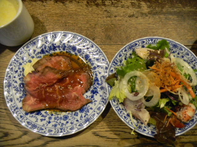 写真左、ローストビーフ(roast beef)。写真右、サラダ(salad)。写真左上の、スープ(soup)は、コーンスープ(corn soup)。