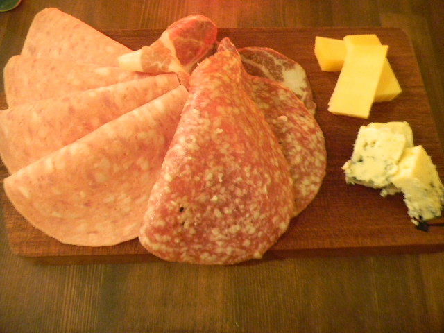 この時、この店で食べた、おつまみの一つ。ハム(ham)とチーズ(cheese)の盛り合わせ。この時、まだ、腹は、満腹状態であったので、おつまみは、この、ハム(ham)とチーズ(cheese)の盛り合わせと、オリーブ(olive)だけ食べました。