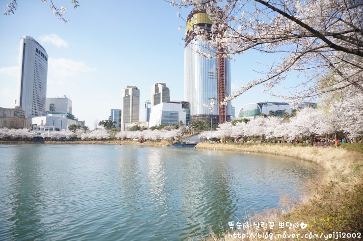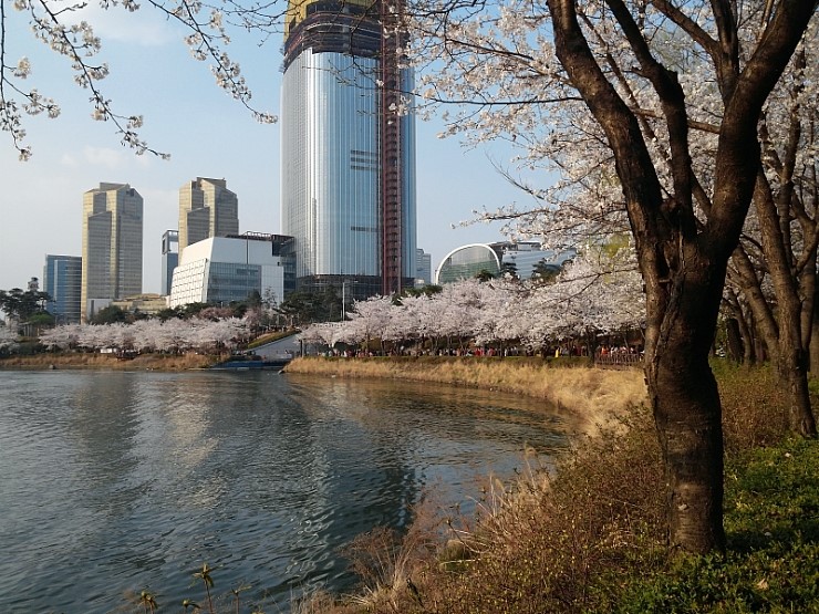 벚꽃 핀 석촌호수 와 123층 롯데월드타워