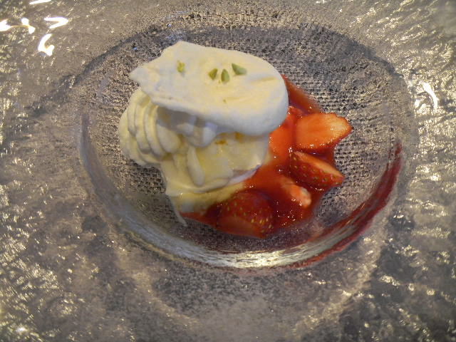 デザート(dessert)は、店を移動して、Denny’s(下の補足説明参照)で食べました。写真は、この時、私が、Denny’sで食べた、苺のデザート(dessert)。彼女は、この時、苺の、サンデー(sundae)を食べました。