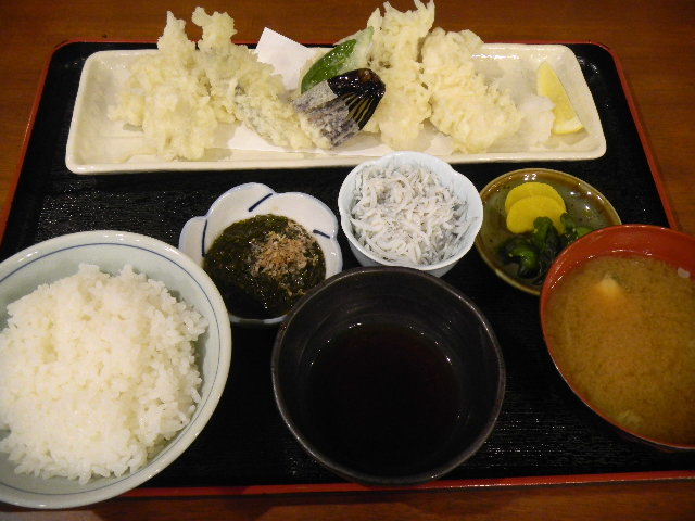 彼女が食べた、天婦羅(魚と野菜の天婦羅)と、ご飯(rice)の、組み合わせの、メニュー(menu)。魚は、太刀魚(largehead hairtail。韓国では、kalchiと呼ばれているのかな?)等。