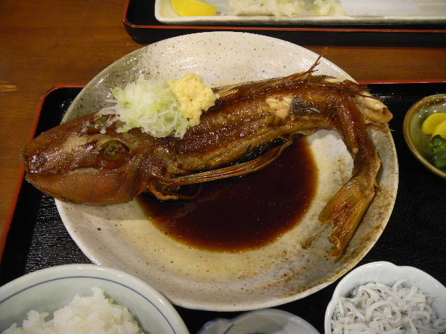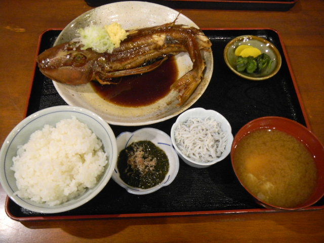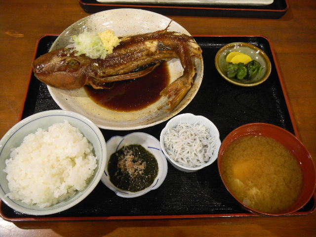 写真以下4枚。私が食べた物。本日の(today’s)、魚の中から、ホウボウ(魚)の、煮付け(煮物)と、ご飯(rice)の、組み合わせの、メニュー(menu)。