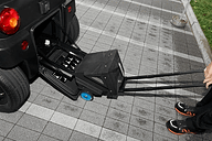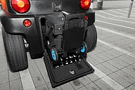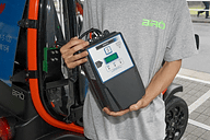 着脱式バッテリーは車体後部から取り外せる。かなりの重量だが旅行用のキャリーバッグのようにタイヤと伸縮ハンドルが付いているため、女性でも容易に移動できるという。充電器と一緒に宅内に運び入れて充電できる