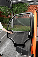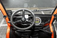 試乗会で体験したのは、サイドドアのあるWINTERでオレンジカラーの車両。スタンダードカラーはホワイト、ブラック、グリーンの3色から選べるが、ス タンダードモデルで塗装されるのはフレームのみで、ボンネットやその他の車体各部はブラックが基調となる。ただし、オプションでフレームとボンネットのカ ラーを99色から選択することが可能だ。