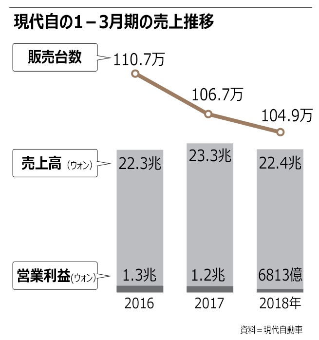 自動車業界は最悪の実績を記録している。今年1-3月の現代自の営業利益は前年同期の半分(6813億ウォン=691億円)だった。現代自は今年4月の販売台数がやや回復したが、16年4月に比べると5%少ない。韓国GMの場合は、国内販売台数が前年比で半分に減り、双竜自動車も4月の販売台数が前月を3.9%下回った。
