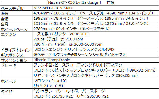 50주년 기념 모델의 이름은 「Nissan GT-R50 by Italdesign」이다.개발, 설계, 제조를 다룬 것은 이탈디자인.