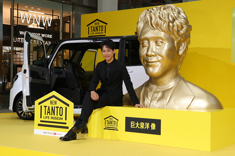 「NEW TANTO LIFE MUSEUM」の1日館長に就任した大泉洋さんと金色に輝くシンボル「“巨”大泉洋」