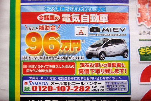 ジャパネットたかたでもヤマダ電機でもビックカメラでも売られているMITSUBISHI「i-MiEV」。よく見ると、「ヤマダ電機がおすすめするエコ家電」だと。エコカーではなく、エコ家電なのか。