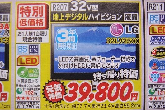 さて、広告を見るとLGの32LV2500というテレビが投げ売りされていました。「特別低価格」「元気特価」だって。それで、年間平均電気代は1,760円ねぇ。