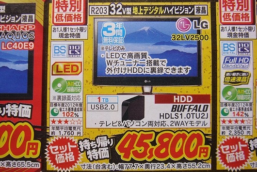 それでもLGのテレビが売れないヤマダさん。色々考えて、1TBのHDDをセットにして45,800円で投げ売り。TVだけでなくPCでも使える2WAYのHDDというのがミソですね。