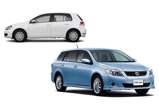 35位のVolkswagen「Golf」と10位の「COROLLA (FIELDER)」。「Golf」はエコカー減税対象であることに加え、ステーションワゴンモデルの「Golf Variant」やミニバンモデルの「Golf Touran」もラインナップされており、海外メーカーの車種としては唯一、日本車並みの販売台数を記録した。