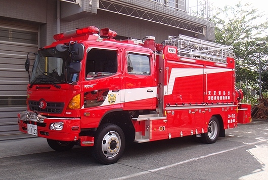 同じくHINO「RANGER」の機動救助車(レスキュー車)。手前は都費導入(緑+白塗装)で平野ボデー製作所製、奥は国費導入(青+白塗装)でクレーン付きの帝国繊維製です。
