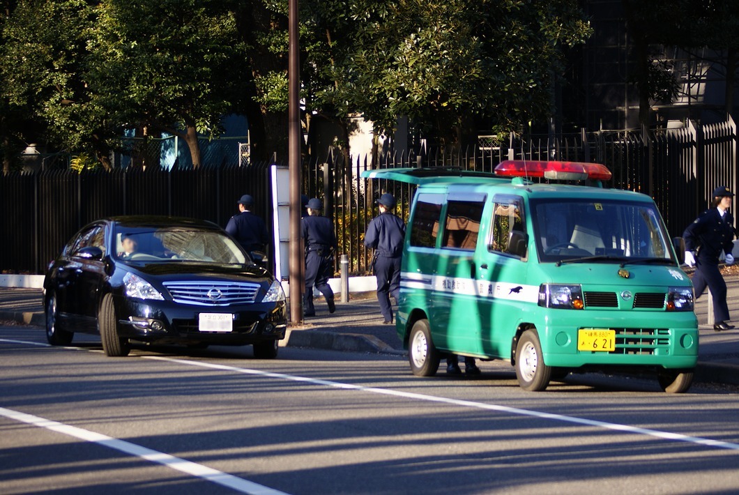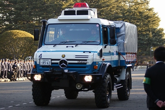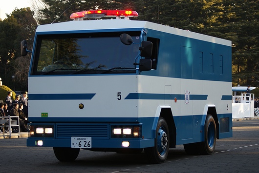 경찰차에 이어, 기동대의 특수 차량이나 대형차 양이 행진합니다.이것은 소형 경비차.MITSUBISHI-FUSO제입니다.