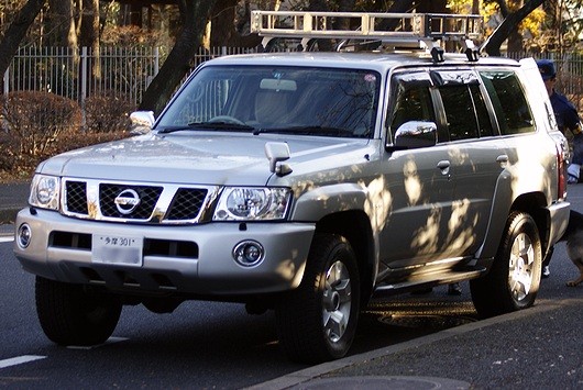 NISSAN「SAFARI」の警察犬搬送車。車両後方に犬の後ろ脚が見えています。