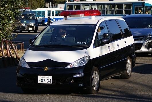 TOYOTA「ESTIMA」のパトカー。首都高4号線がずっと事故で通行止めになっていたのですが、調布まで下道で帰ったのでしょうか。