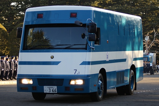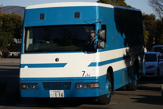 パトカーに続き、機動隊の特殊車両や大型車両が行進します。これは小型警備車。MITSUBISHI-FUSO製です。