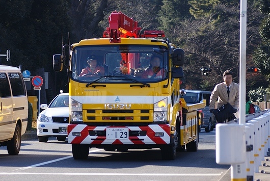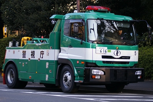 UD TRUCKS(旧NISSAN DIESEL)「Quon」の災害用大型レッカー車。全部隊・全車両がいっせいに帰還すると渋滞になるので、年頭部隊出動訓練終了後も会場周辺では警察車両が大量に停車しています。