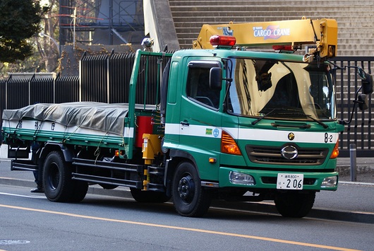 HINO「RANGER」の資材運搬車。先ほどの車両と異なり、平屋タイプでクレーン付きです。