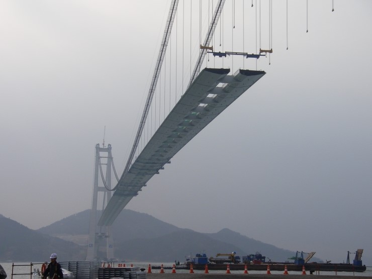 지난해 12월 6일 첫 상판 거치작업을 실시한지 44일만으로 초대형 여객기인 에어버스사의 A380 42대에 해당하는 2만3773톤에 이르는 90개 상판이 이순신大橋 메인케이블에 완전히 연결됐다.