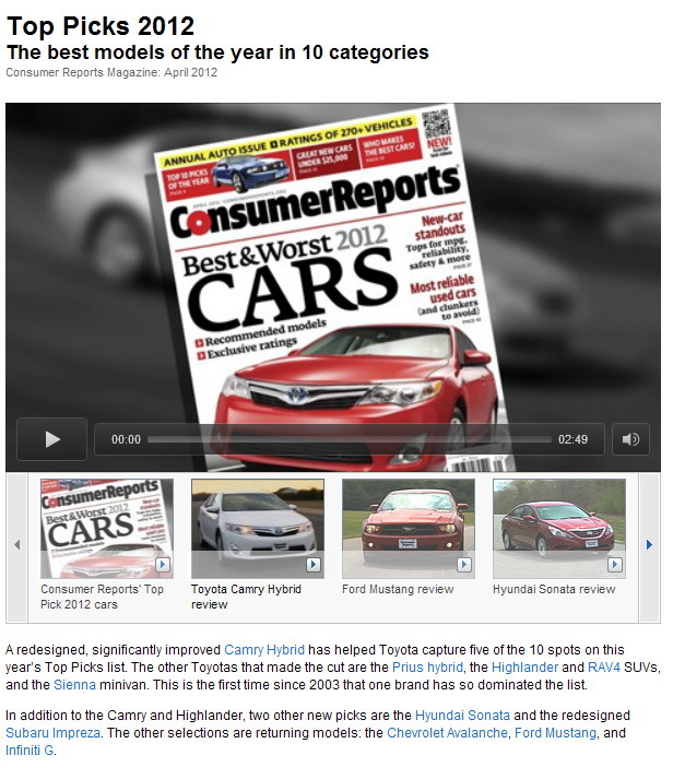 컨슈머 리포트 발표에 의하면 최고의 중형차로 선택된 것은 토요타의 캠리 하이브리드다. 캠리 하이브리드는 우리의 중형차에 해당하는 패밀리 세단 부문에서 쟁쟁한 경쟁차이등을 쳐 없애 최고의 차로 평가되었다. 토요타는 중형차 부문 그 외에도 컨슈머 리포트가 구분한 10개 부문안 5개 부문에서 최고의 차로 선택되었다.
