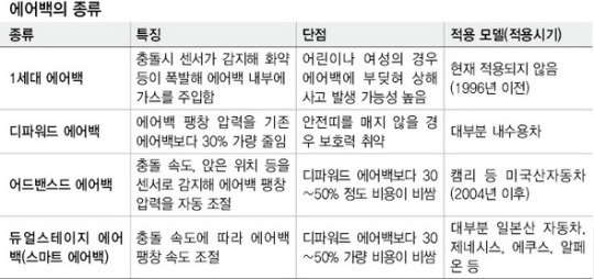 催研究員によればアメリカのエアバッグ安全基準は 1990年代以後二度変わった. 1996年エアバッグ内部膨脹圧力を既存より 30%ほど低めるようにしたのに相次いで 2003年頃衝突の中もあぶよって膨脹圧力をエアバッグが自動調節するように規定を変えた. 1996年規定変更は子供と女性がエアバッグにぶつかって傷害を被る場合を防止するための取り計いだったし, 2004年規定変更は安全帯を結ばない場合にもエアバッグの保護力を育てるためだ. 1996年規定によるエアバッグがすぐデ−パウォドエアバッグ, 2003年規定が適用されたエアバッグがオドベンスドエアバッグだ.