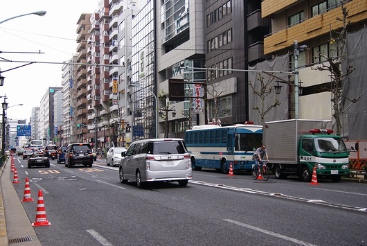 池袋付近から渋谷付近まで、明治通りに延々と置かれたコーンや警察車両。