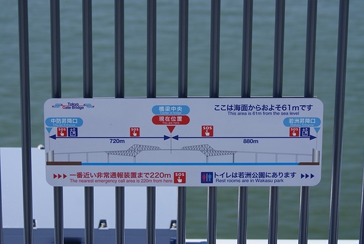 다리의 중앙 부분으로 해 최고 지점인 장소에 도달했습니다.해면에서 도로까지의 높이는 약 61 m입니다.도쿄 게이트 브릿지는, 도쿄동 항로를 항행하는 대형선박을 통과할 수 있도록 54.6 m의 높이를 확보하고 있습니다.