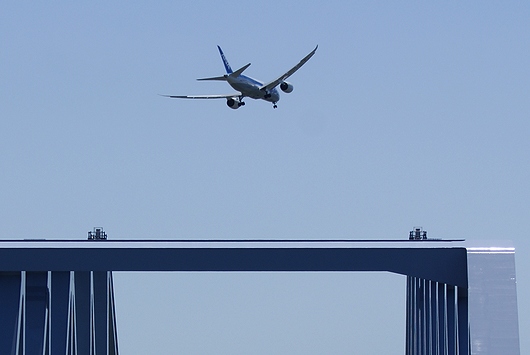 橋の上を飛んでいく飛行機。東京ゲートブリッジは、橋の下を国際船舶が通過する一方、東京国際空港(羽田空港)B滑走路にアプローチする航空機の経路上にもあります。航空法に定められた制限98.1m以下にするため、橋全体の高さは87.8mに抑えられています。この橋が吊り橋ではなく、奇抜な形のトラス橋になった理由が、そこにあります。