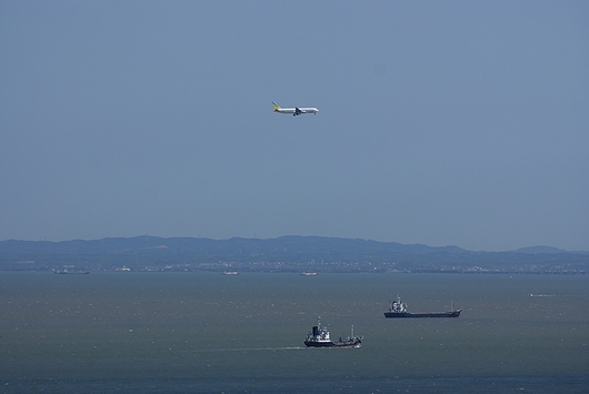 橋の上から見た千葉県房総半島。あの飛行機は、D滑走路に降りるAir Doの機体です。