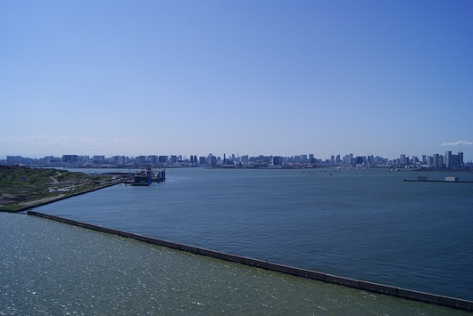 東京ゲートブリッジからは、東京の街が一望できます。海の色が手前と奥で違っていますね。