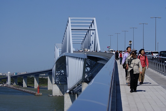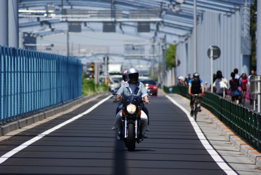 그런데, 차도와 달라 보도는 슬로프상태가 되어 있지 않습니다.보행자는 9층건물의 승강탑을 올라 8층의 도로 연락층에서 보도로 나옵니다.보행자가 개의 산책 등, 애완동물을 데려 걸을 수 없습니다(시중드는 개를 제외하다).또, 이 다리는 일반도로입니다만, 레인보우 브릿지등과 같이 원동기 부착 자전거·자전거등 경차량의 통행이 도로 교통법에 의해 금지되고 있습니다.