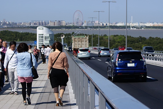 도쿄의 관광 스포트나 후지산을 보면서, 다리로 나아갑니다.