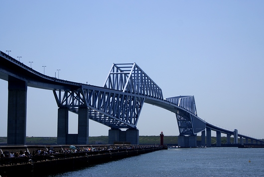 다리 위를 날아 가는 비행기.도쿄 게이트 브릿지는, 다리아래를 국제 선박이 통과하는 한편, 도쿄국제공항(하네다 공항) B활주로에 어프로치 하는 항공기의 경로상에도 있습니다.항공법으로 정해진 제한 98.1 m이하로 하기 위해, 다리 전체의 높이는 87.8 m에 억제되어 있습니다.이 다리가 조교가 아니고, 기발한 형태의 트러스교가 된 이유가, 거기에 있습니다.