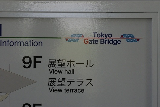 さて、車道と違い歩道はスロープ状になっていません。歩行者は9階建ての昇降塔を登って8階の道路連絡階から歩道に出ます。歩行者が犬の散歩など、ペットを連れて歩くことはできません(介助犬を除く)。また、この橋は一般道ですが、レインボーブリッジなどと同様に原動機付自転車・自転車等軽車両の通行が道路交通法により禁止されています。