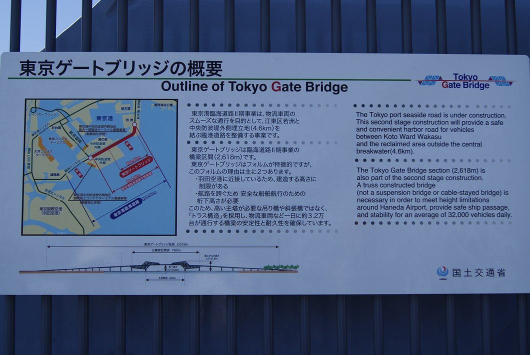 국토 교통성이 설치한 도쿄 게이트 브릿지의 개요를 설명하는 안내판.육상 부분의 콘크리트 교각 어프로치 구간을 포함 전체 길이 2,618 m의 트러스교입니다.
