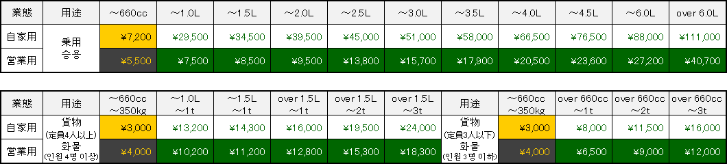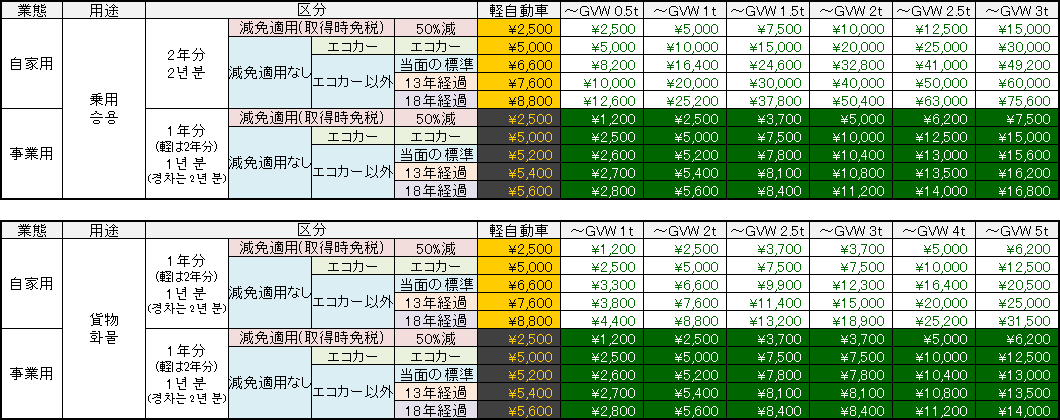 하나 더,1-31년에 1회지불할 필요가 있는 세금으로서 「자동차 중량세」가 있습니다.일본에서는, 자동차는 차량검사를 통과하지 않으면 공도를 주행할 수 없습니다.그 차량검사 때에 납부할 필요가 있는 세금으로, 국세입니다.자동차 중량세는, 경자동차에 대해서는 일률적이고, 등록차의 경우는 차량총중량에 의해서 금액이 바뀝니다.또, 2012년 5월부터 신세제가 시작되어, 신차취득시에 면세였는지, 에코카 규제·기준(2005년 배출 가스 기준, 포스트신장기 배출 가스 규제, 2010년도 연비 기준 또는 2015년도 연비 기준등)에 적합하고 있는지, 첫도 등록으로부터 13년 경과하고 있는지, 첫도 등록으로부터 18년 경과하고 있을까에 의해서, 더욱 금액이 바뀝니다.위의 겉(표)는, 차량검사 2번째에 필요한 승용차와 화물차의 경자동차세 및 자동차 중량세를 발췌한 것입니다(취득시의 차량검사 1회째만은, 차량검사 유효기간의 관계로부터 금액이 다릅니다).