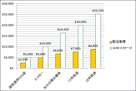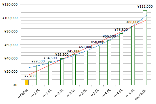 자가용의 승용차에 걸리는 경자동차세·자동차세를 발췌해, 그래프로 하는 곳과 같이 됩니다.경자동차세만이 비정상으로 싼 것을 압니다.