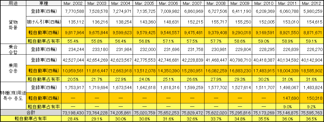 일반 재단법인 자동차 검사 등록 정보 협회의 데이터를 기초로 계산하면, 이것은 모든 사륜 자동차안의 36.5%인 것을 알 수 있었습니다.그것을 겉(표)로 하면, 위와 같이 됩니다.모든 사륜 자동차의 대수는 75,595,763대, 집경자동차는 27,607,891대였습니다.