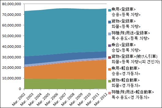 겉(표)가 아니고, 그래프로 하는 곳과 같이 됩니다.경자동차가 증가하고 있다고는 해도, 10년전에 비교하고, 일본의 자동차 대수는 전체적으로 조금 증가하고 있는 것을 알 수 있습니다.
