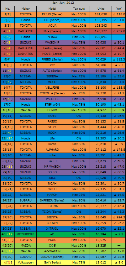 2위에는 「FIT」, 3위에는 「AQUA」가 들어가,1-3정도를 HV가 있는 차종이 독점했다.1-6달은 기간을 통해서 에코카 보조금·감세의 대상이었기 때문에, 히트 상품도 HV나 연비 성능의 비싼 차에 집중했다.DAIHATSU의 경자동차 「Mira」도 포함해 상위 4 차종이 달평균 2만대 페이스가 되는 12만대를 넘었다.